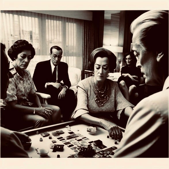 It’s just before Christmas, December 1967. Hollywood star and soft-drink mogul Joan Crawford reaches across the dining table of her Manhattan apartment, and slides a final $1 billion-dollar bill onto the game board. “Gentlemen,” she intones to her fellow PepsiCo board members arrayed around the table, “We will have commercial transportation by rocket ship by 1986.”
