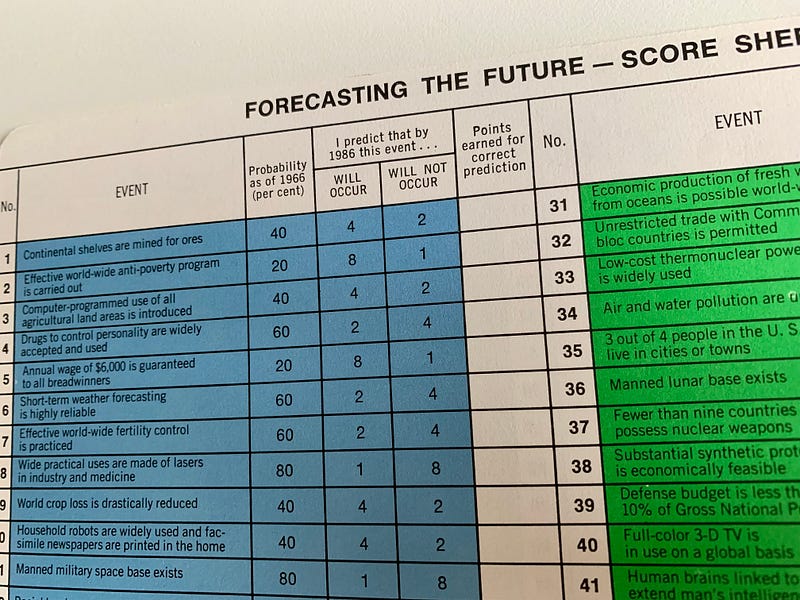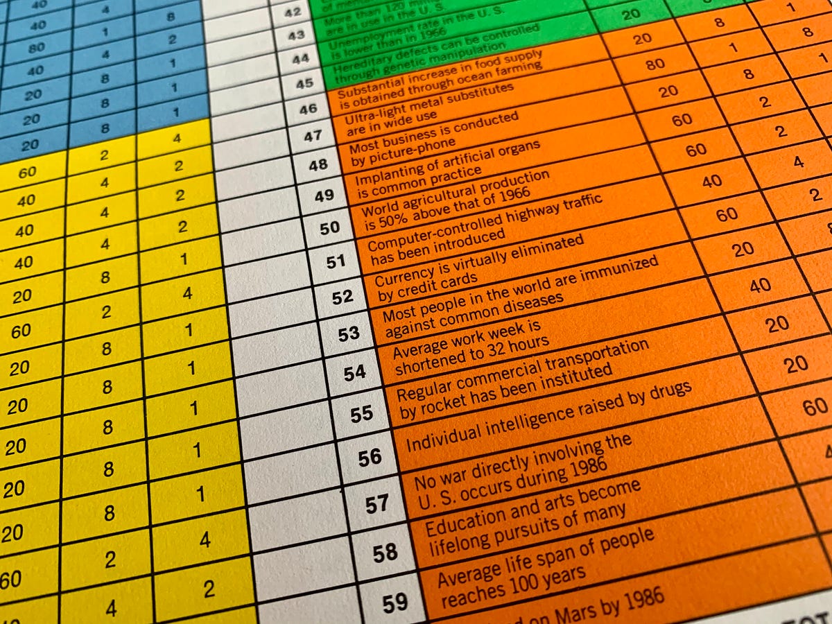 The next ingredient was “when.” To make forecasts a game, as with superforecasting or prediction markets, a payoff date is needed to validate a claim; one needs a date when the validity of the forecast can be concretely measured, otherwise it just remains a prediction. In the case of “Future,” Helmer and Gordon took the target date of the source study: 1986, twenty years later, setting up a symmetry with Kaiser’s 20-year commemoration. If so much had happened in politics, science and society since 1946, what might be possible another two decades hence?