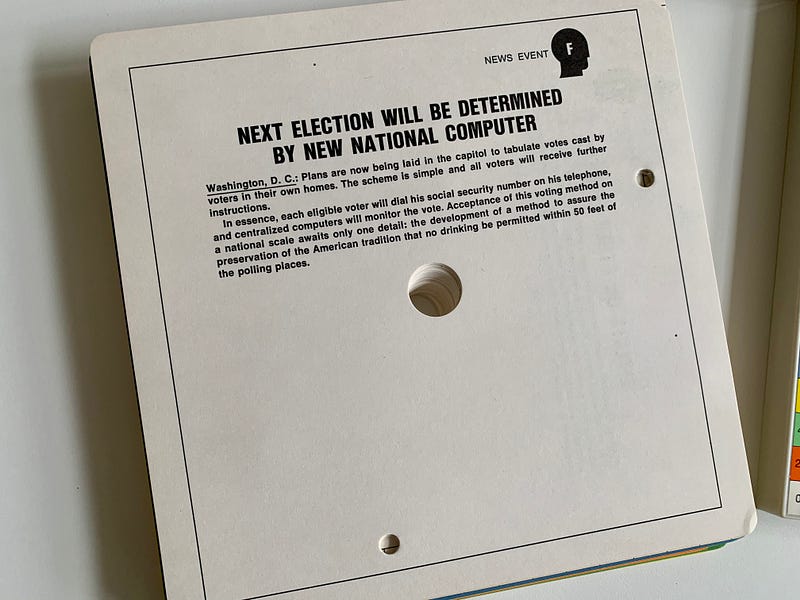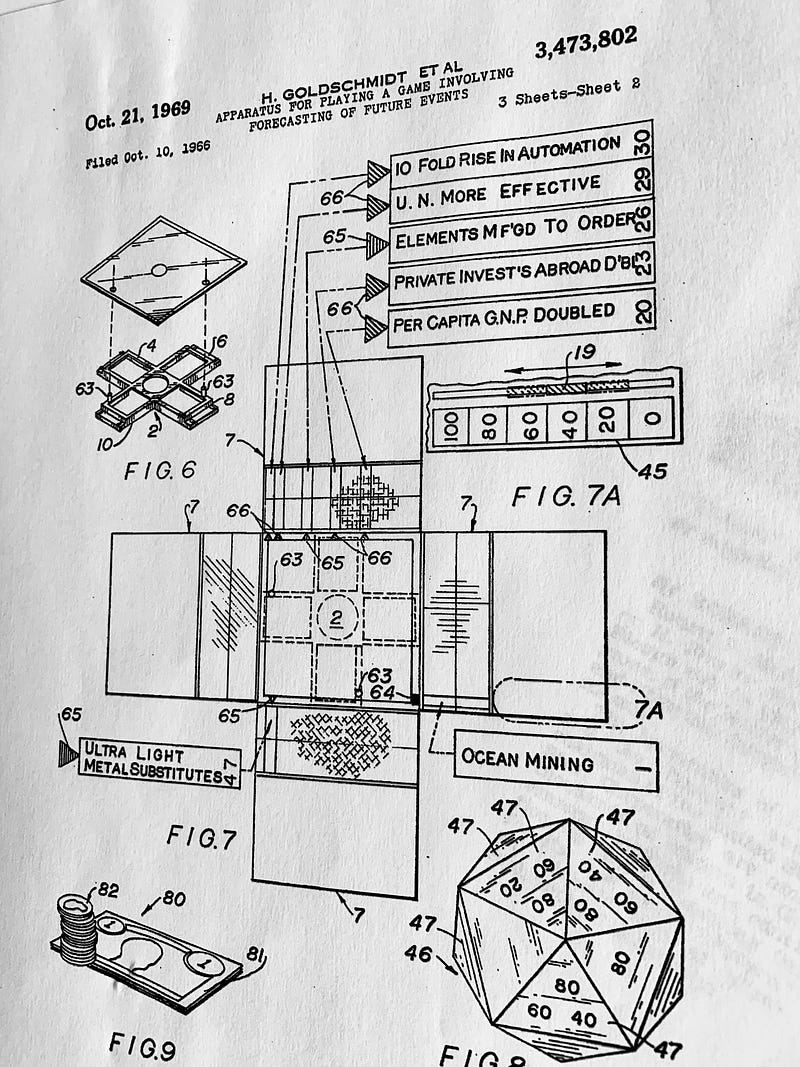 Elsewhere across America, dinner parties and game nights devolve not into rounds of Monopoly or The Game of Life, but something a bit more sophisticated — a game of prediction, testing the prognostication powers of the great and good, from garden clubs to middle American rec rooms. By the early 1970s, thanks to a brightly colored table-top game stocked with paper money, dice and a dizzying array of future possibilities, people across the country, of all walks of life, could add forecasting to their everyday skill set, alongside reading, writing and arithmetic. America had become a nation of parlor prognosticators.
