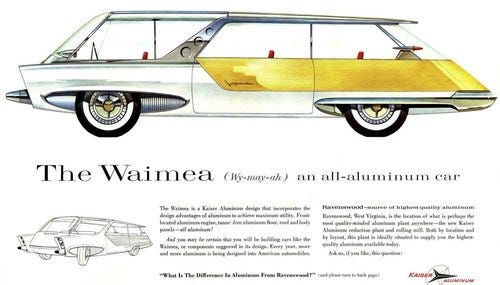 It wasn’t Kaiser’s first time trying to spark the public imagination about the future, however. The company had ventured into everything from geodesic domes for public architecture to space-age vehicle designs to discussing telemobility and cybernetics, investing deeply in messaging the future in the public mind over the decades. It was an early tenant of Disney’s Tomorrowland at the Disneyland park in California, selling visitors on the current and future promise of aluminum. Kaiser’s director of publications in the 1960s, Don Fabun, compiled the trippy forays into early corporate futurism found in Kaiser’s company magazine into several volumes, including “Dimensions of Change” and “Dynamics of Change,” both of which looked at coming shifts in society, technology, food, mobility and beyond.