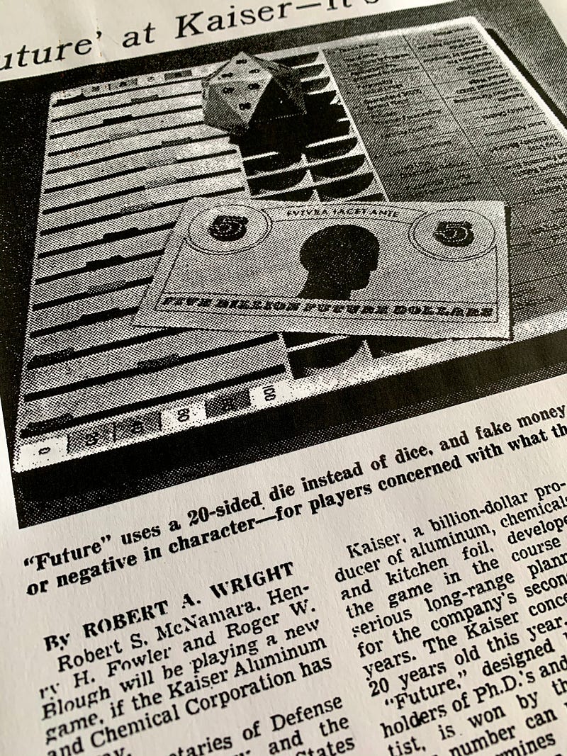 The catalyst for the game’s creation was the 20th anniversary of Kaiser Aluminum & Chemical Corporation, but they weren’t the principal developers of Future. In an effort to come up with a special gift to celebrate the company’s rapid post-WWII expansion — it had supplied the US government metals for aircraft and ships, and later everything from cars, to pots and pans, to TV-dinner trays — Kaiser approached the fabled RAND Corporation, which was helping it with long-range planning for the next two decades. Kaiser’s request was for RAND to create something that could teach that capability to a wider audience. Having seen success with its own ventures into what were then growth markets for cars, housing, and anything else containing products like aluminum, Kaiser wanted captains of industry to understand how making big bets on change could usefully bend the world to their interests.