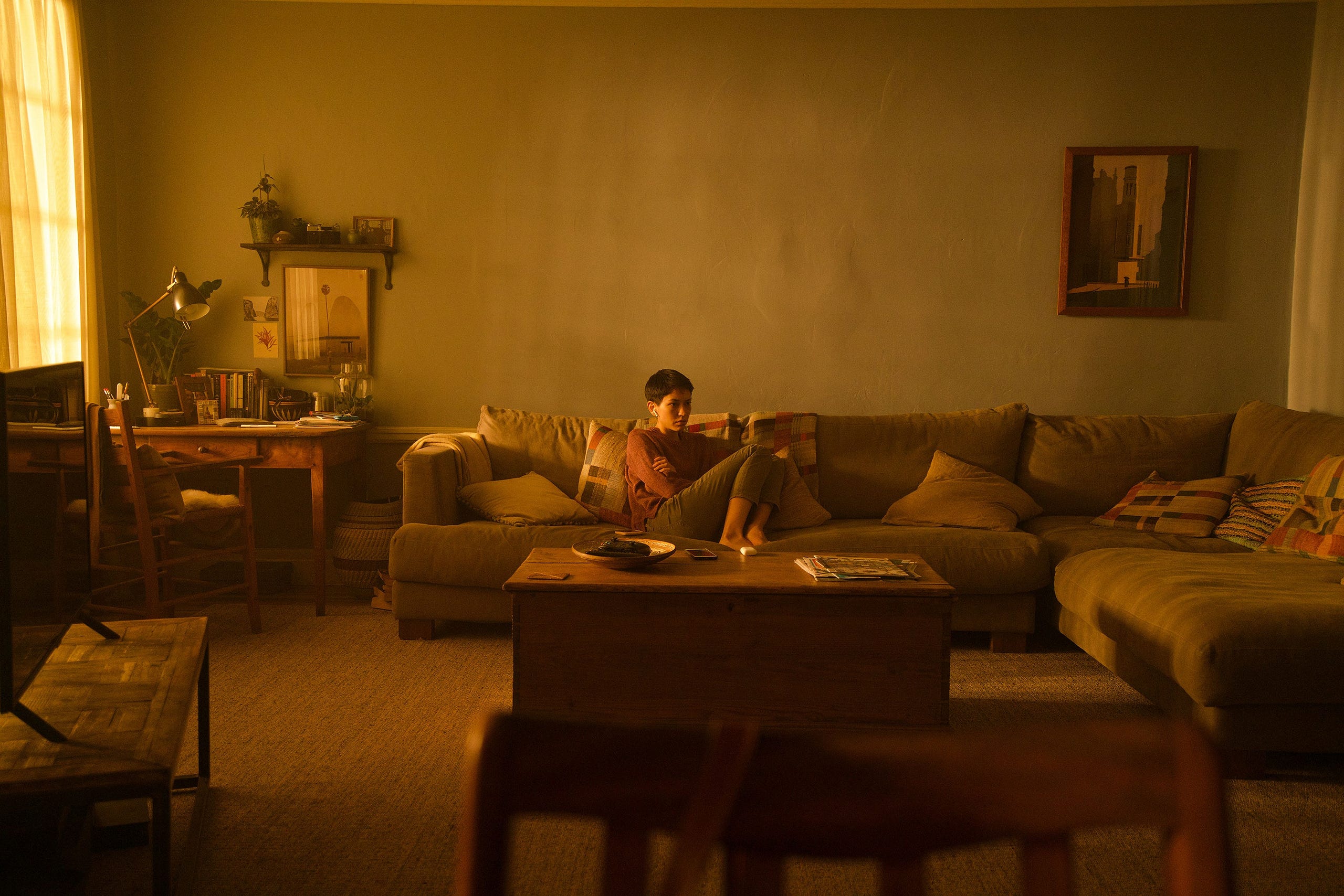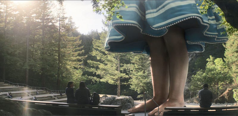 In the opening seconds of the first episode, we see Forest standing seemingly alone in a wood after dusk, followed quickly by the contrasting hardness of San Francisco, itself a kind of “edge of the world,” geographically, culturally, economically and intellectually (even this city, in its seeming emptiness and silence, fits Scovell’s definition of “urban wyrd”). We soon find out this Patagonia-perfect woodland is home to the sequestered, almost retreat-like campus of Amaya, Forest’s tech company, situated amid the remaining evergreen forests that dot the peninsula. Sited on the real-life campus of UC Santa Cruz, mythical Amaya sits adjacent to, but distinctly apart from the sprawling suburbs and strip malls of Silicon Valley — at the edge of the edge, reminiscent of Summerisle of The Wicker Man, accessible but distant enough.