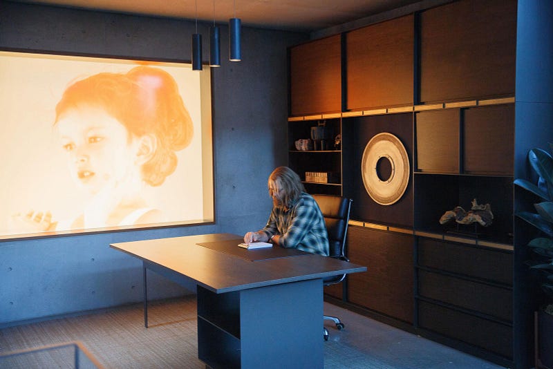 Even as a buzzing campus full of techies mill about with ant-like energy, Amaya is no typical corporate home. It is a kind of hushed cathedral of brutalist bulk, overshadowed by the colossus of Amaya herself — a towering statue of Forest’s dead daughter — set amongst a kind of reverential amphitheater where employees go to contemplate the infinite. The sweeping drone’s eye view gives us an overview of both Amayas, figure, and space, glinting in the golden hour (those with sharp eyes and good memories may recall the name of the desolate installation within the Shimmer in Garland’s Annihilation: Fort Amaya).